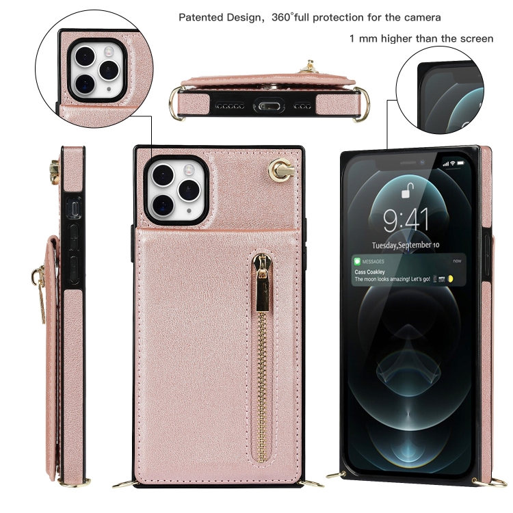 Funda Trasera para iPhone 11 Pro Max Cross-Body Zipper Square TPU y Pu con Soporte, Ranuras para Tarjetas y Billetera (Oro Rosa)