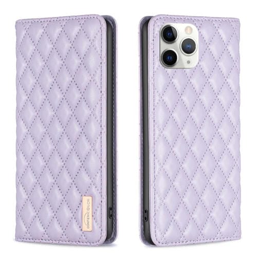 Funda de teléfono para iPhone 11 Pro Max Diamond Lattice con tapa de cuero magnético (Púrpura)
