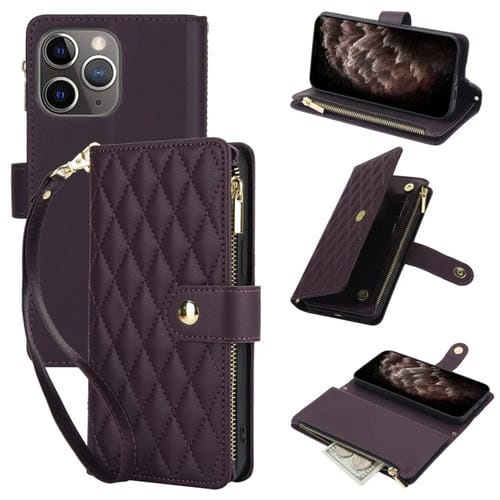 Funda de Cuero para iPhone 11 Pro Max Ym016 con Billetera, Tarjeta, Cremallera Rómbica y Cordón (Púrpura Oscuro)