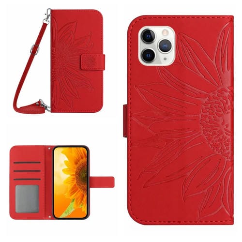 Funda Flip de Cuero para iPhone 11 Pro Skin Feel Sun Flower Pattern con Cordón (Rojo)