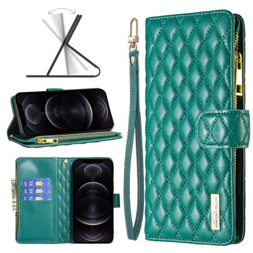 Funda para iPhone 12/12 Pro Diamond Lattice Zipper Wallet de Cuero con Tapa (Verde)