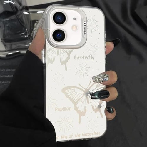 Caja de Teléfono Híbrida para iPhone 12 TPU para PC Pintura Plateada (Mariposa Hueca Blanca)