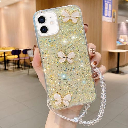 Funda para Teléfono TPU Epoxi iPhone 12 Mariposa de Jade Lentejuelas Estrelladas con Correa (Amarillo)