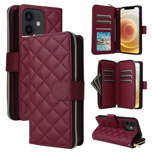 Funda para Teléfono iPhone 12 Mini Cuero Hebilla Torre Cremallera Rombal Cruzada Cordón (Rojo Vino)