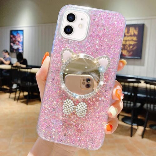 Funda para Teléfono iPhone 12 Mini TPU Epoxi con Espejo y Orejas de Gato con Lentejuelas Estrelladas (Rosa)