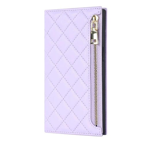Funda de Cuero para iPhone 12 Mini Grid Texture con Lanyard y Cremallera (Púrpura)