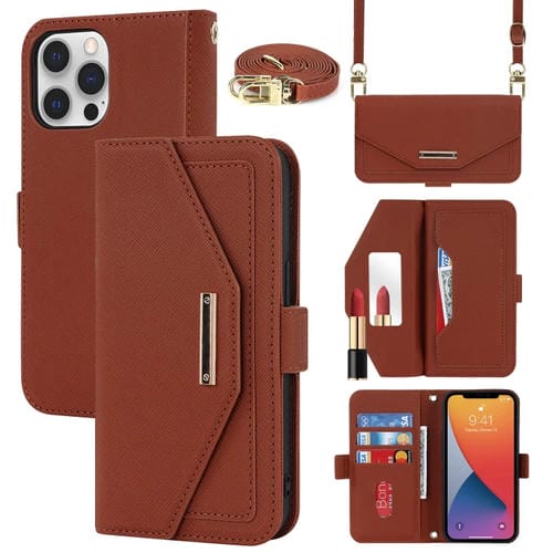 Funda de Cuero para Teléfono iPhone 12 Pro Max Cross Texture Lanyard (Marrón)