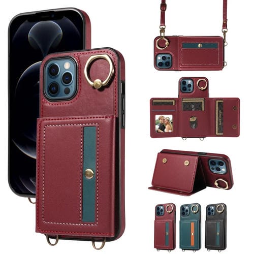 Funda para Teléfono iPhone 12 Pro Max Cuero con Soporte para Anillo y Bolso Cruzado para Tarjetas (Rojo)