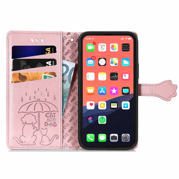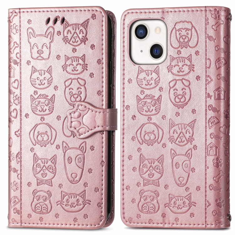 Estuche de Cuero para iPhone 13 con Tapa Horizontal En Relieve Gato y Perro Soporte Ranuras Billetera Cordón (Oro Rosa)