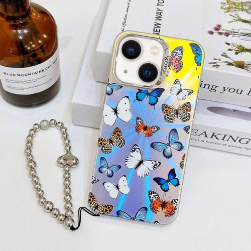 Funda para Teléfono iPhone 13 con Mariposa Láser Galvanizada y Correa para Muñeca (Mariposas de Color)