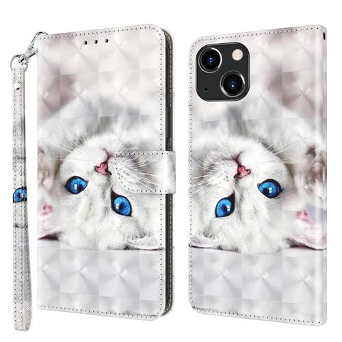 Pour iPhone 13 mini Étui de téléphone en cuir peint en 3D (réflexion de chat blanc)