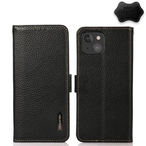 Funda para iPhone 13 Mini Khazneh Litchi Cuero Genuino Side-Magnetic Rfid (Negro)