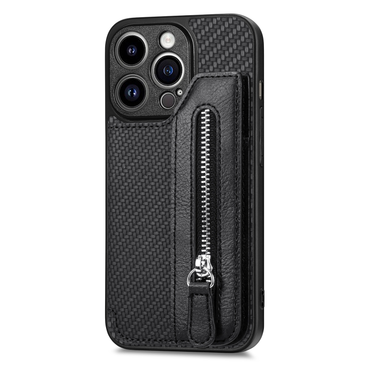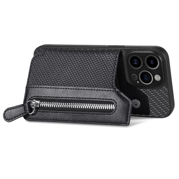 Funda para iPhone 13 Pro Carbon Fiber Horizontal Flip Zipper Wallet (Negro)