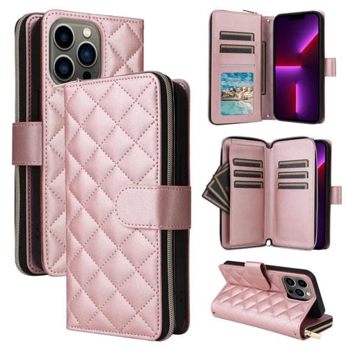 Funda para Teléfono iPhone 13 Pro Cuero con Hebilla Torre y Cremallera Rombal Cruzada con Cordón (Oro Rosa)