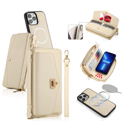 Estuche para teléfono iPhone 13 Pro Magsafe Crossbody con billetera y cremallera de cuero litchi (Blanco)