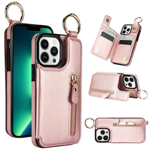 Funda para Teléfono iPhone 13 Pro Max Litchi Texture Cremallera Doble Hebilla con Bolsa para Tarjetas (Oro Rosa)