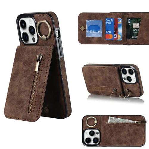 Pour iPhone 13 Pro Max Anneau rétro et fermeture à glissière Étui de téléphone avec fente pour carte RFID (marron)
