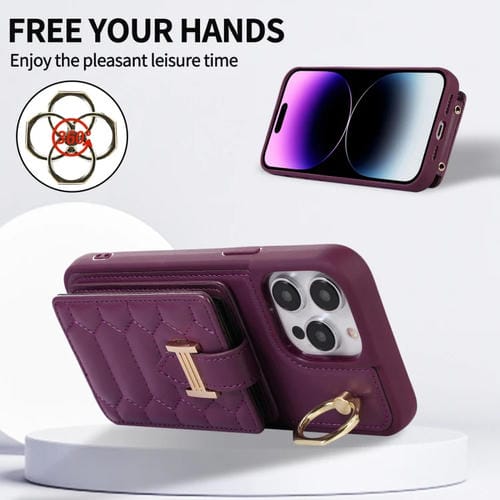 Funda para iPhone 13 Pro Max Vertical Card Bag Ring Holder con Doble Cordón (Morado Oscuro)