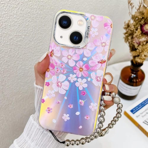 Funda para Teléfono iPhone 14 Flor Láser Galvanizada con Correa para Muñeca (Flor Rosa)