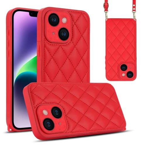 Funda para Teléfono iPhone 14 Textura Rómbica y Cordón Doble (Rojo)