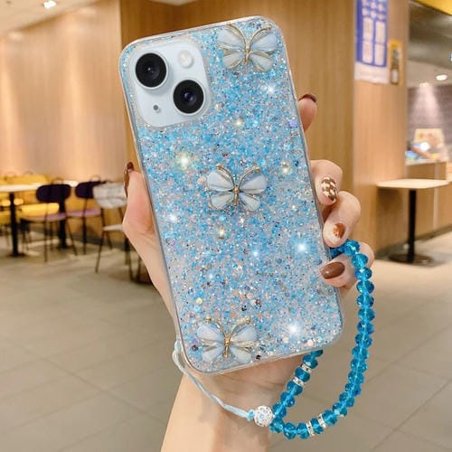 Funda para Teléfono TPU Epoxi iPhone 14 Mariposa de Jade Lentejuelas Estrelladas con Correa (Azul)