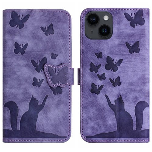 Funda para Teléfono iPhone 14 Plus Cuero con Tapa y Estampado de Gato Mariposa (Púrpura)