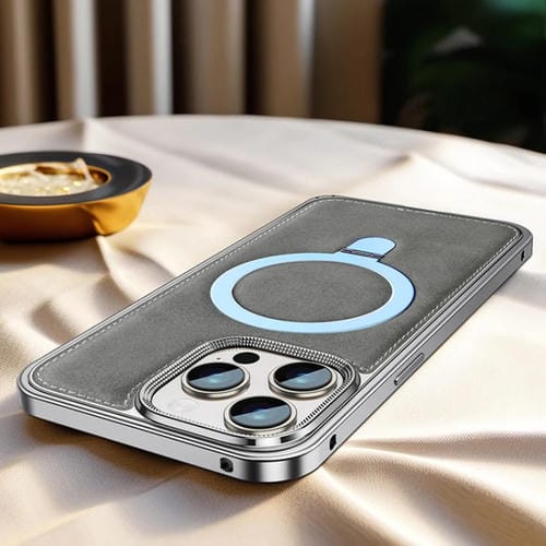 Estuche para Teléfono iPhone 14 Pro Magsafe Cuero Cera de Aceite Marco Metal Soporte Hebilla Resorte (Gris)