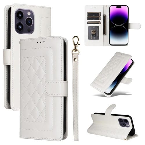 Funda de Cuero para iPhone 14 Pro Max Diamond Lattice con Tapa (Blanco)