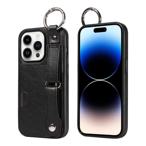Pour iPhone 14 Pro Max Calf Texture Card Slot Ring Phone Case (Noir)