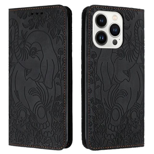 Funda para Teléfono iPhone 14 Pro Max Cuero Relieve Elefante Retro (Negro)