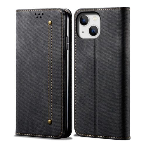 Funda de cuero para iPhone 15 Denim Texture con tapa horizontal (Negro)