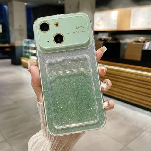 Estuche para Teléfono iPhone 15 con Brillo Degradado Ventana Grande y Ranura para Tarjeta (Verde)