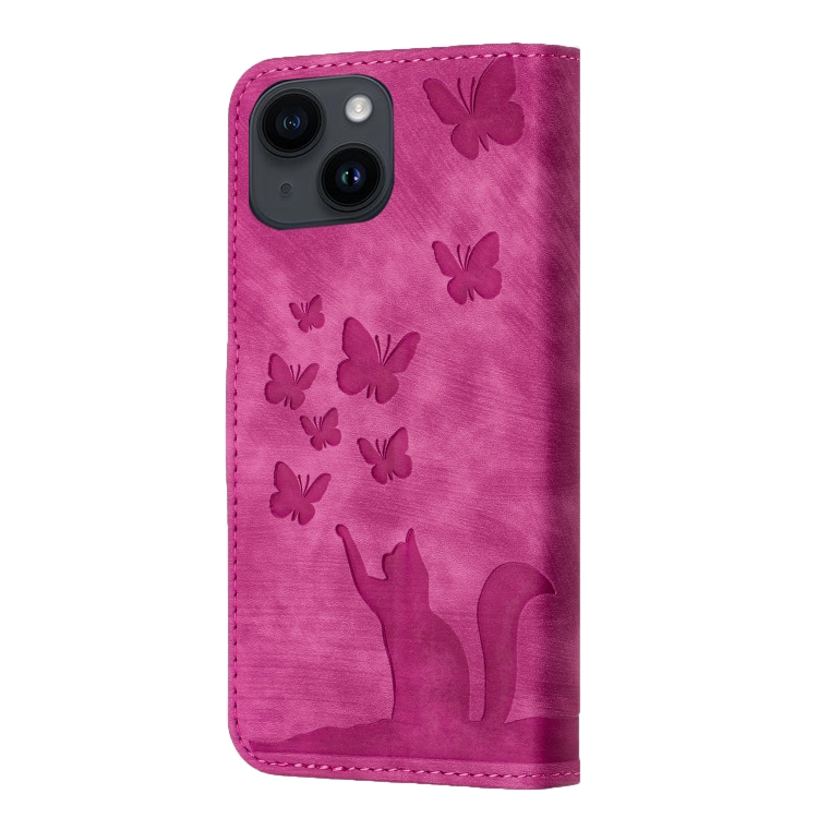 Funda de Cuero para iPhone 15 con Tapa y Estampado de Gato Mariposa (Rosa)