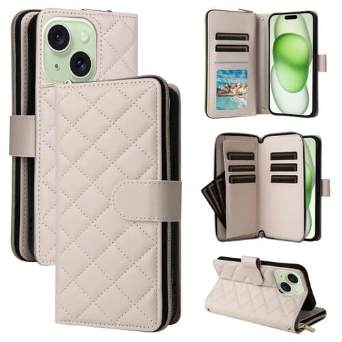 Pour iPhone 15 Plus/14 Plus Étui à bandoulière en cuir à boucle de tour Étui de téléphone à fermeture éclair rhombique avec lanière (Beige)