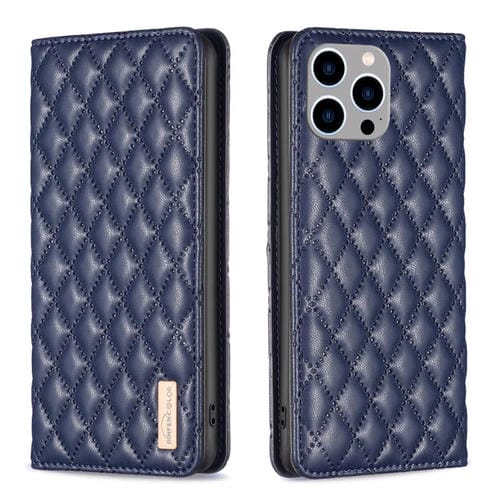 Funda de Teléfono iPhone 15 Plus con Tapa de Cuero Magnético Diamond Lattice (Azul)