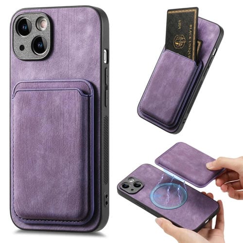 Funda de teléfono iPhone 15 Plus magnética con bolso de tarjeta de cuero retro (Púrpura)