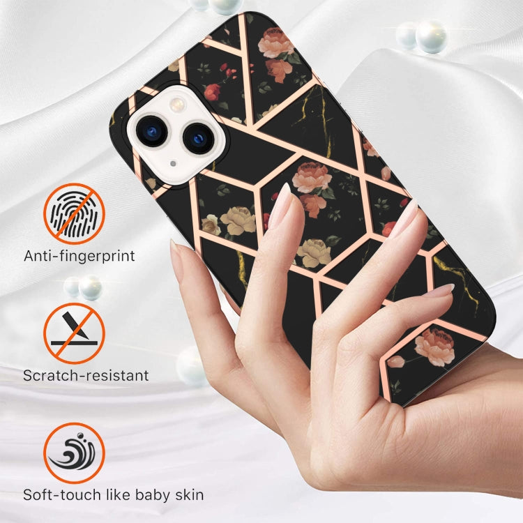 Pour iPhone 15 Plus Coque antichoc en TPU à motif de fleur de marbre d'épissage de galvanoplastie (fleur noire)