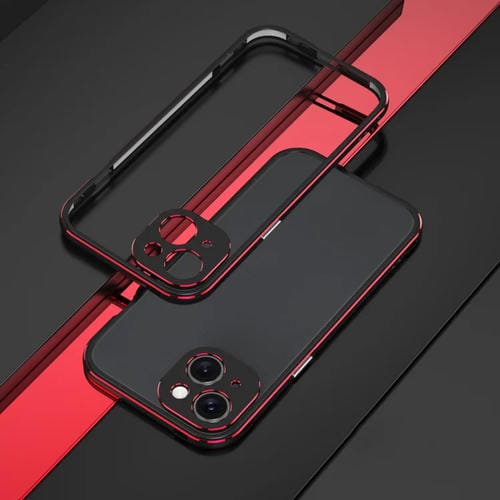 Protector de Lente + Estuche para Teléfono iPhone 15 Plus Serie Aurora con Marco de Metal (Negro Rojo)