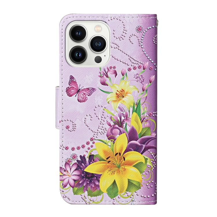 Estuche para teléfono iPhone 15 Pro cuero con tapa dibujo coloreado 3D (Flores Amarillas)