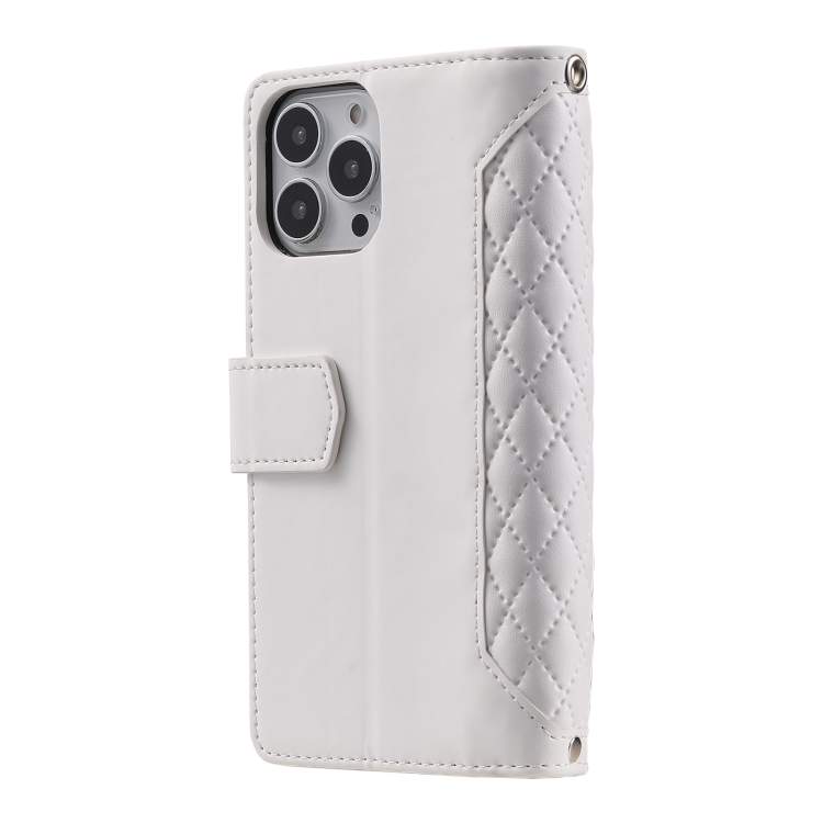Funda de Cuero para iPhone 15 Pro Grid Texture con Cremallera y Cordón (Blanco)