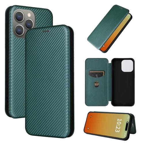 Funda para iPhone 15 Pro Max Carbon Fiber Texture Flip de Cuero (Verde)