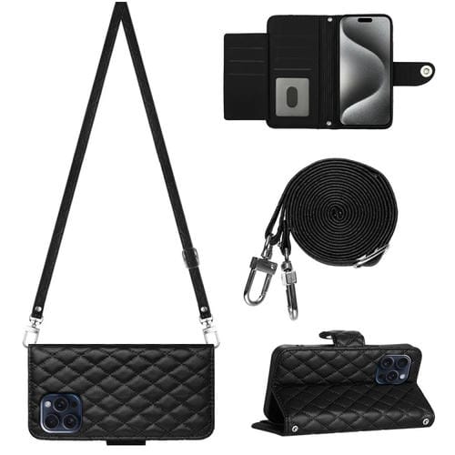 Funda para Teléfono iPhone 15 Pro Max Tapa de Cuero Textura Rómbica Cordón Largo (Negro)