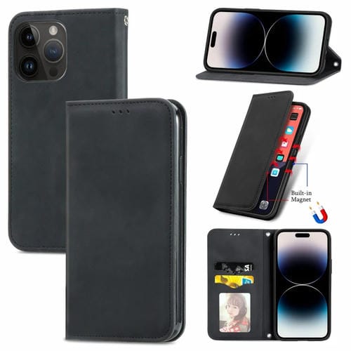 Pour iPhone 15 Pro Retro Skin Feel Étui de téléphone en cuir à rabat magnétique (Noir)