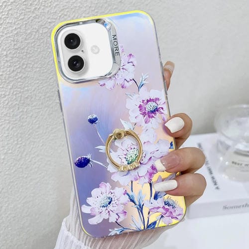 Caja de teléfono TPU para iPhone 16 con soporte de anillo flor láser galvanoplastia (Zinnia Ah9)