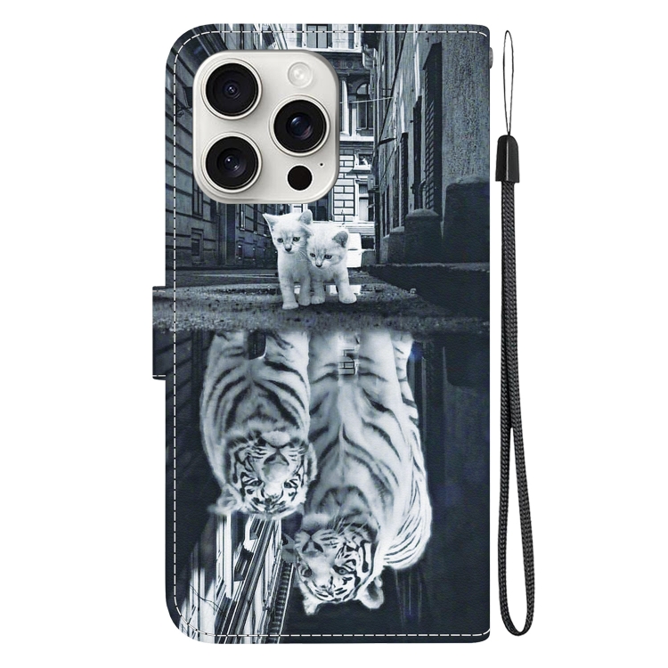 Pour iPhone 16 Pro Max Étui de téléphone en cuir à dessin coloré à texture cristalline (réflexion de tigre de chat)