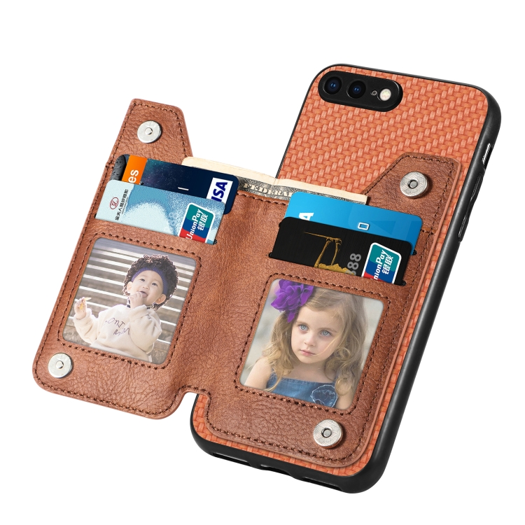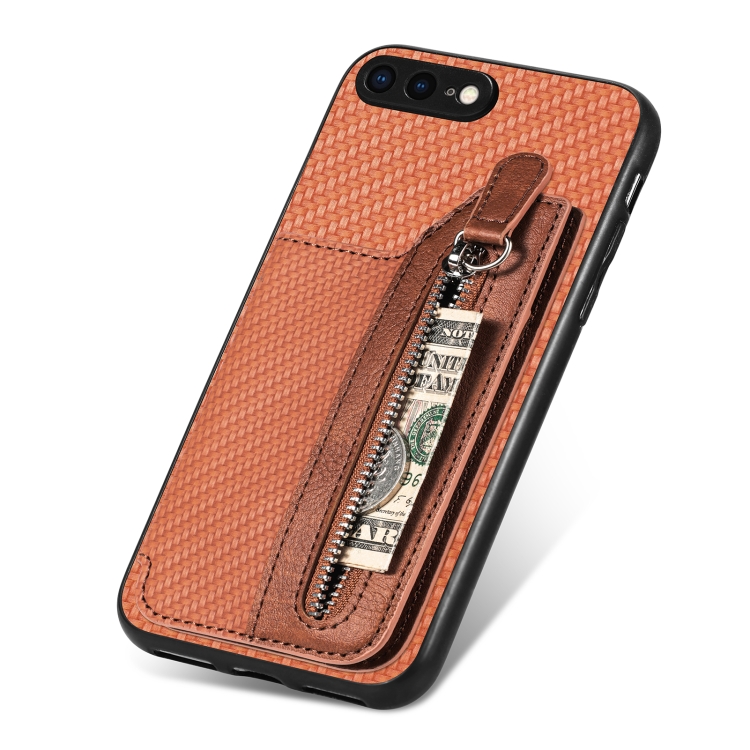 Estuche para Teléfono iPhone 7 Plus 8 Plus con Billetera y Cremallera Horizontal de Fibra de Carbono (Marrón)