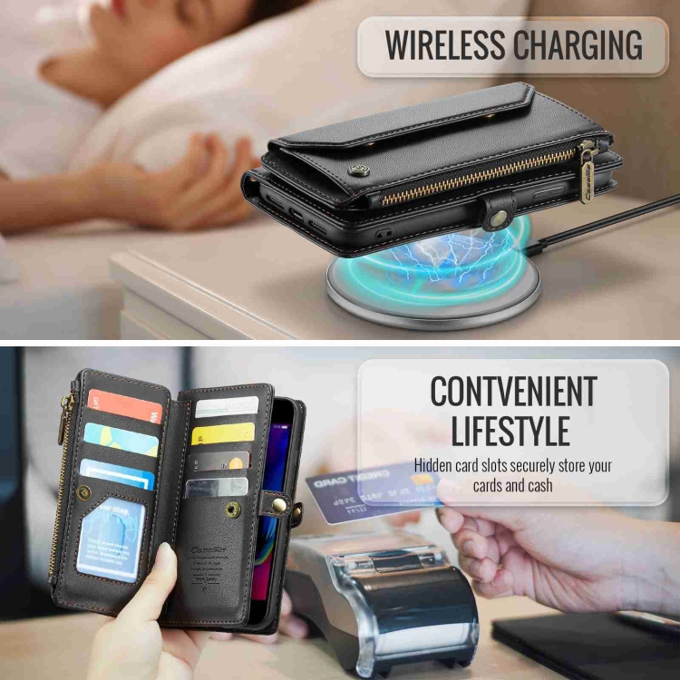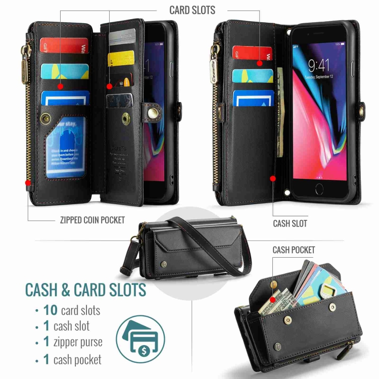 Estuche para teléfono Caseme C36 para iPhone 8 Plus 7 Plus 6 Plus Cartera con ranuras para tarjetas y cremallera Cuero Antirrobo Rfid (Negro)