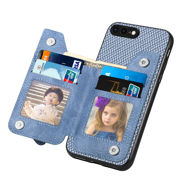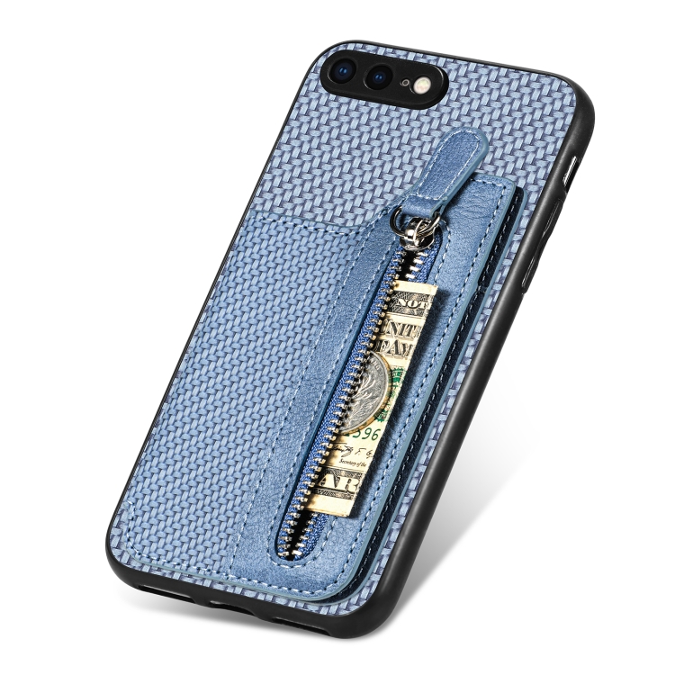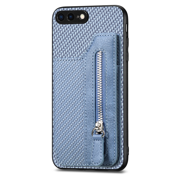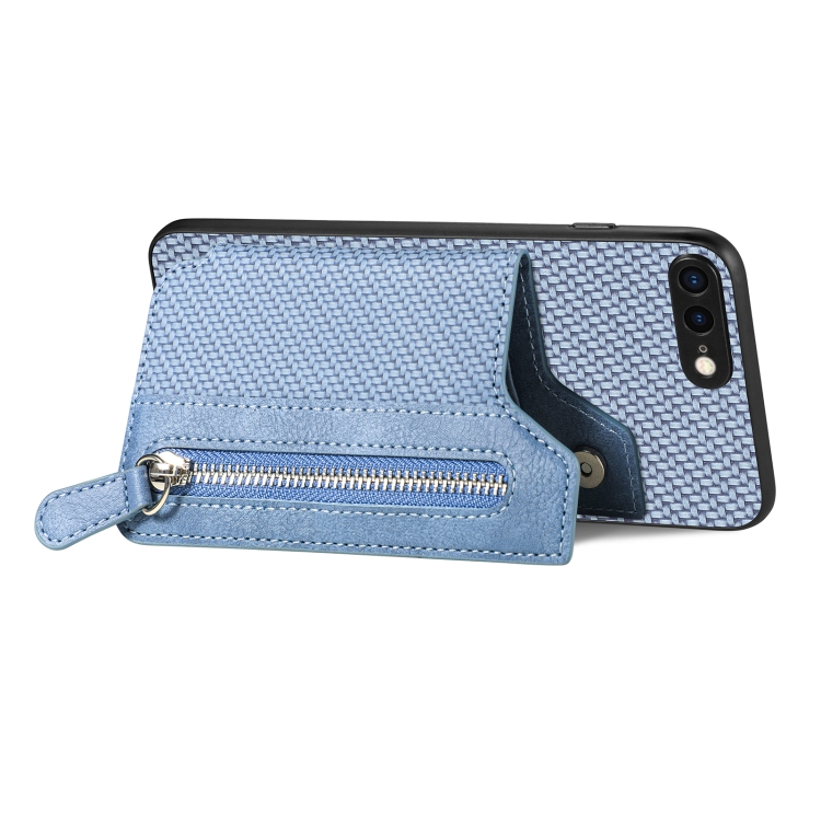Estuche para Teléfono iPhone SE 2022 / 2020 / 7 / 8 con Billetera y Cremallera Horizontal de Fibra de Carbono (Azul)
