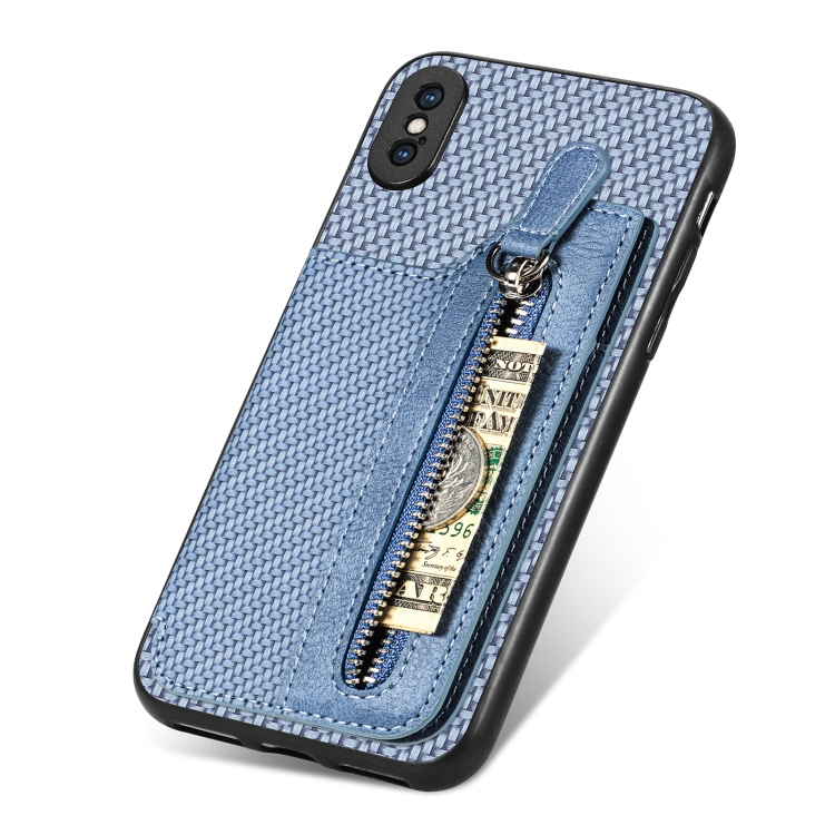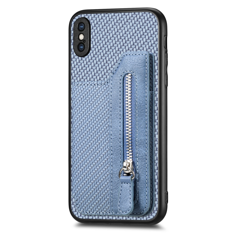 Estuche para Teléfono iPhone X Xs con Billetera y Cremallera Horizontal de Fibra de Carbono (Azul)