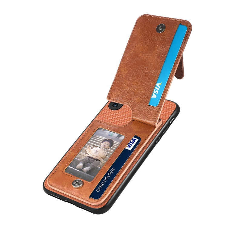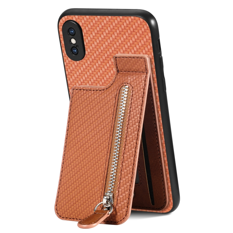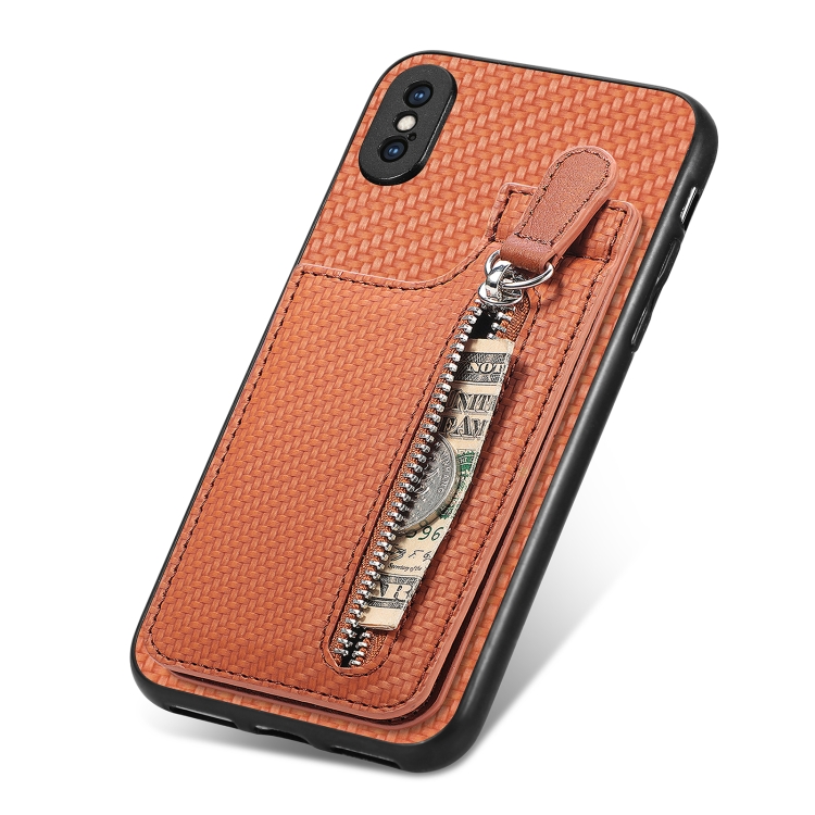 Funda de teléfono iPhone X / Xs con cremallera vertical de fibra de carbono (Marrón)
